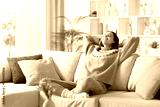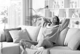 Happy woman in winter relaxing and breathing at home