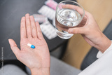 Sick, asian young woman, girl hand holding pill capsule, painkiller medicine from stomach pain, head ache, pain for treatment, take drug or vitamin and glass of water at home, pharmacy and health care