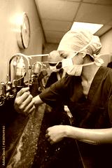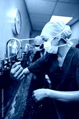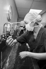 Surgeon, woman or washing hands in hospital with water for medical procedure, disinfection or hygiene. PPE, healthcare people or mask with liquid for cleaning, surgical scrub or protection from germs