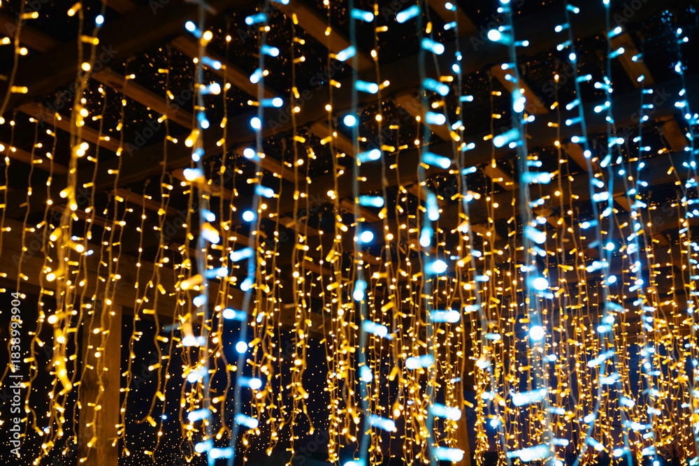 Warm yellow and cool blue holiday lights hanging in strands create a festive bokeh background