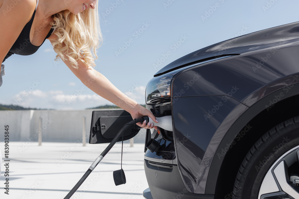 Woman charging electric car at the charging station. Renewable and sustainable energy concept.
