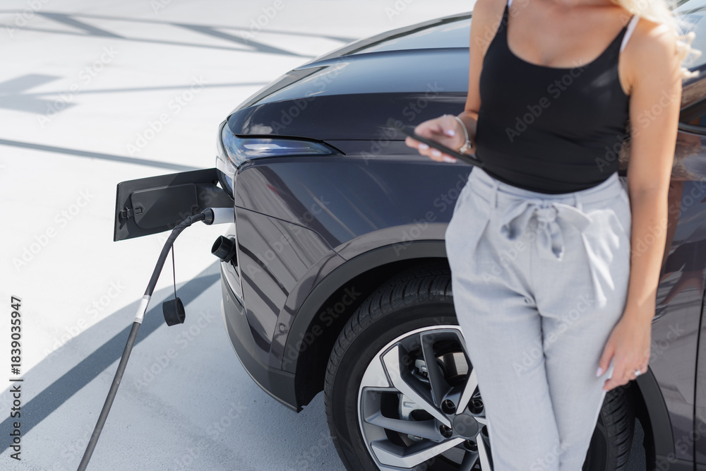 A woman stands beside her electric vehicle while it charges at a charging station in an outdoor location during daytime.