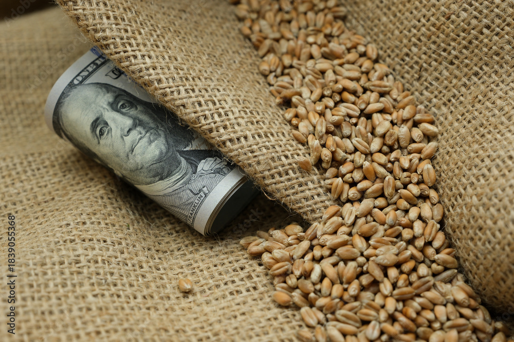 Wheat grains on a coarse jute sack. Folded hundred-dollar bills. Copy space.