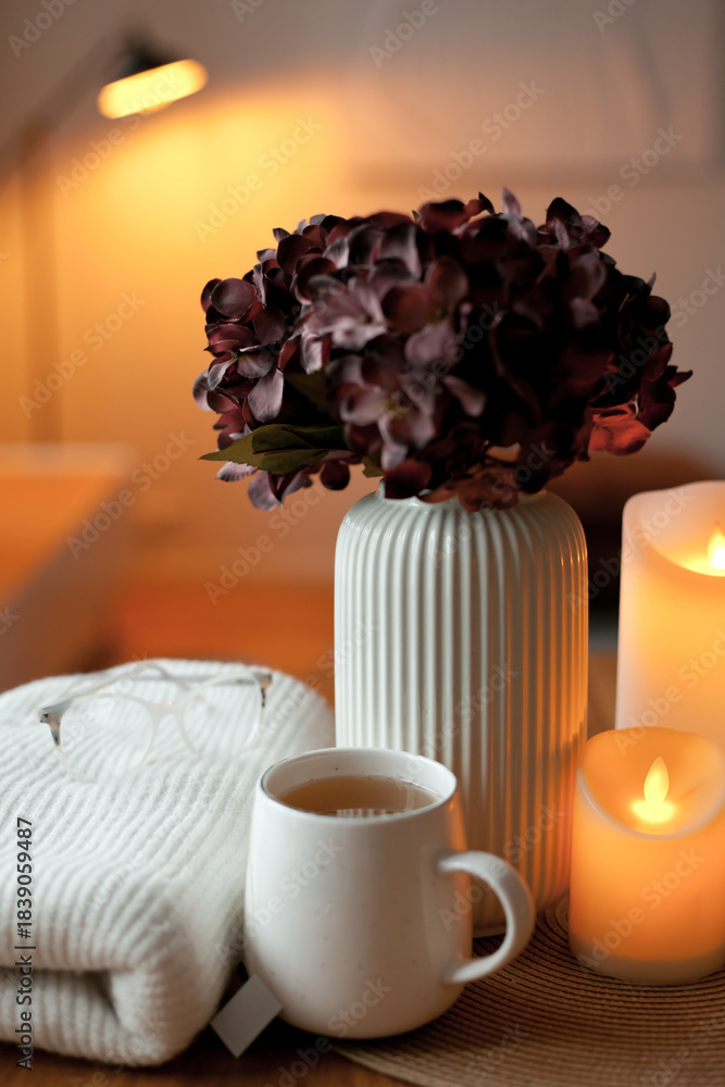 Cozy winter home interior with warm candlelight, wool sweater, hot tea and LED decor creating a calm hygge atmosphere