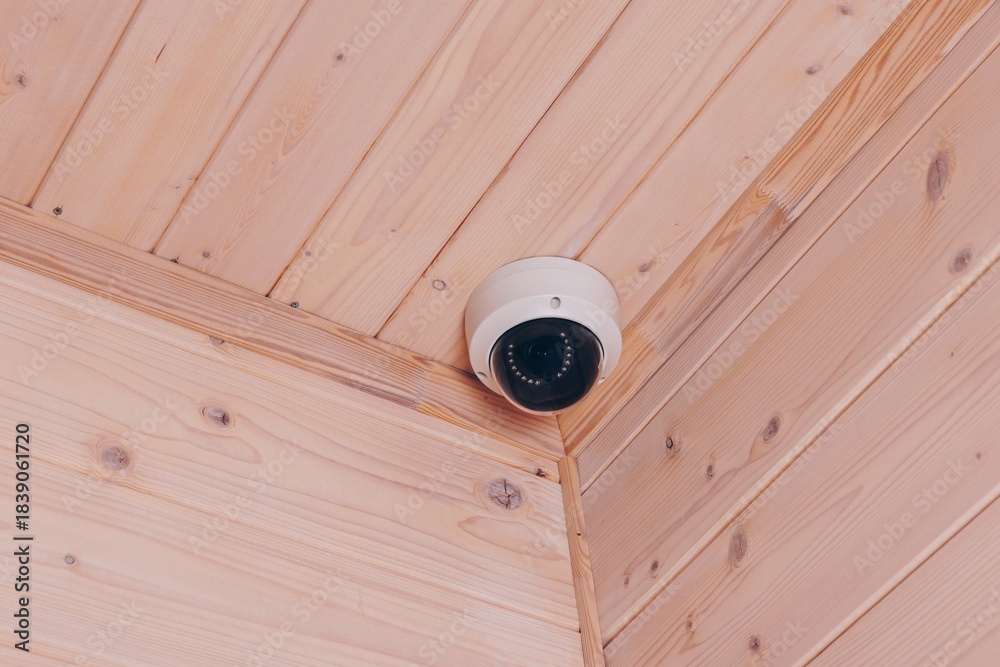 Surveillance Camera Installed in a Cozy Wooden Room Corner Capturing Footage for Security Monitoring