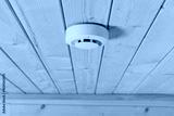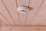 A Modern Smoke Detector Mounted on a Wooden Ceiling, Representing Safety Innovations in Home Technology for Fire Prevention