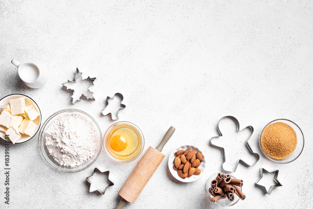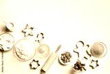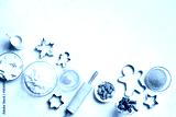Christmas baking background with baking ingredients and cookie cutters