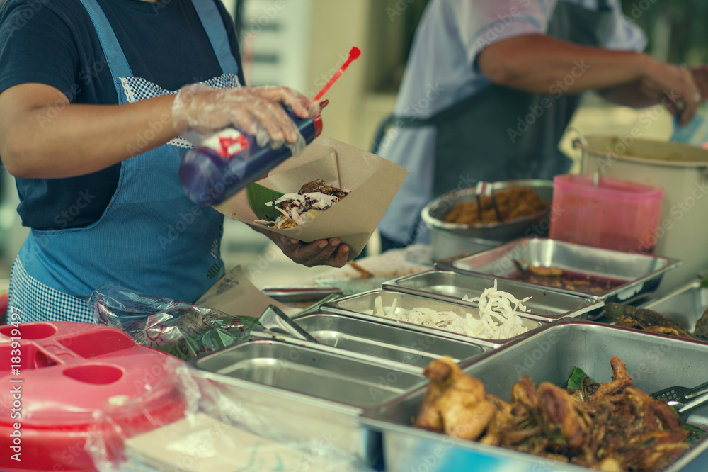 A woman selling a traditional local food Pecal on the the local market in Kuala lumpur. Local traditional street food in Kuala lumpur, Malaysia