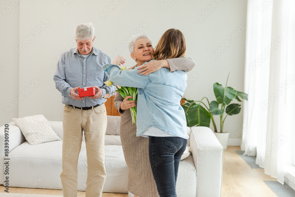 Happy family granddaughter gives gift box spring tulip flowers to grandparents. Teenage girl with bouquet surprise gift box getting congratulations on grandparents day. Family celebrating birthday