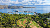 Aerial drone photo of amazing recently renovated Astir Marina with luxury yachts and sail boats in paradise Peninsula of Vouliagmeni, Athens Riviera, Attica, Greece