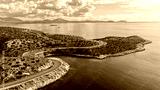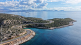 Aerial drone photo of serpent seaside road forming small coves known as "Limanakia" next to famous Asteras Peninsula and lake Vouliagmenis, Athens Riviera, Attica, Greece