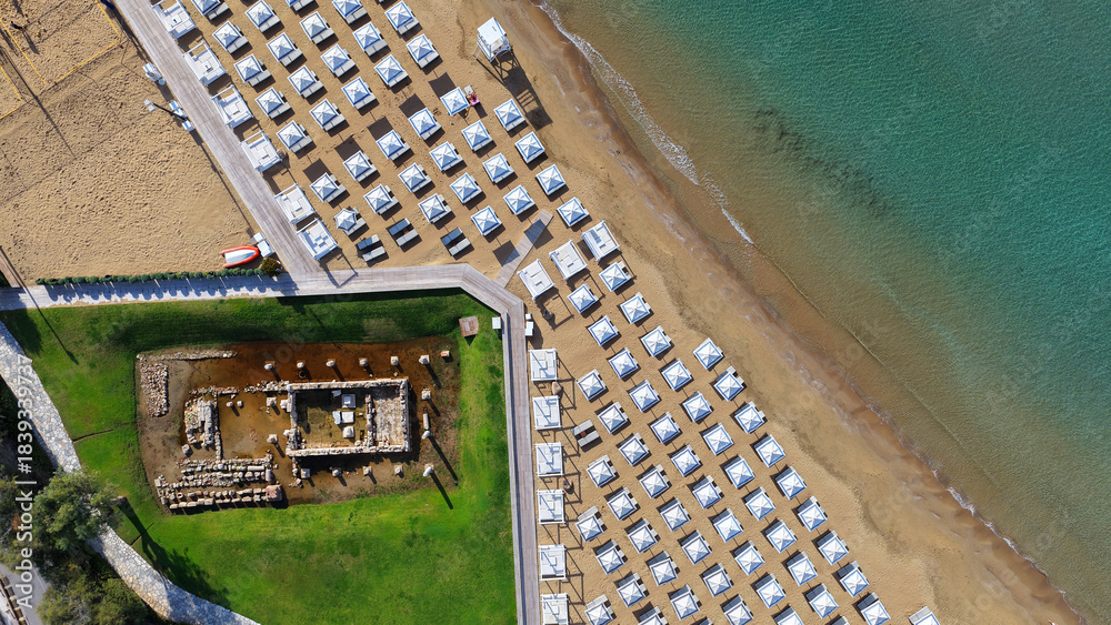Aerial drone photo of amazing organized sandy celebrity beach of Asteras featuring Temple of Apollo Zoster a true ancient cultural heritage, Vouliagmeni, Athens riviera, Greece
