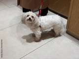 Maltese dog looking up inside store environment. Gentle expression, emotional connection, domestic pet presence and soft urban lifestyle moment.