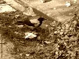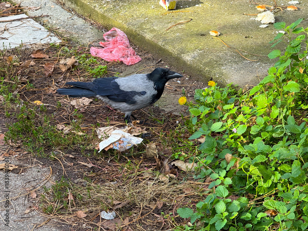 Hooded crow searching for food outdoors. Wildlife, survival, autumn nature and urban coexistence in a city environment