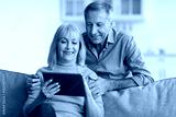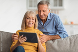 A happy older couple sits closely on a sofa, smiling as they look at a tablet together. They are in a bright living room filled with warmth and comfort.