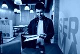 Office worker reviewing printed documents in modern workspace while smiling during a productive day