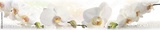 White orchid blossoms with fresh dew drops in a bright panoramic floral composition with soft light and delicate reflections
