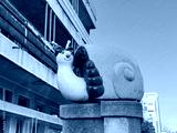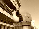 Playful snail sculpture with bow standing on concrete pedestal under blue sky. Whimsical street art, vivid decoration, joyful urban detail bringing charm and character to city space.