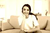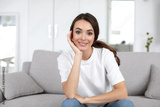 Woman in a white shirt is smiling and looking at camera.