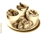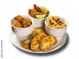 Delicious portion of fried fish, fried chicken, french fries and cheese brunchetta