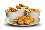 Delicious portion of fried fish, fried chicken, french fries and cheese brunchetta