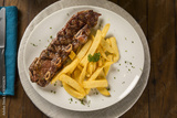 Ribs streak with french fried. A rib steak is a beef steak sliced from the rib primal of a beef animal, with rib bone attached.