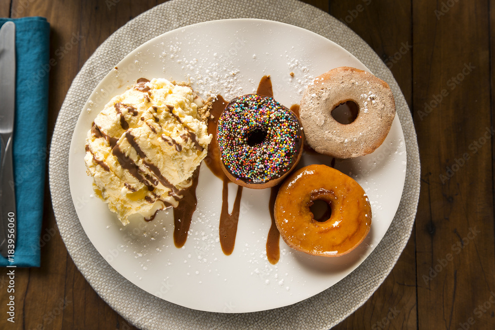 delicious dessert donuts with ice cream on a white plate with decoration on a wooden table