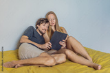 Woman and man relaxing together on a bed while looking at a tablet, enjoying a calm morning atmosphere. Lifestyle, technology use and togetherness concept, representing comfort, bonding, digital media