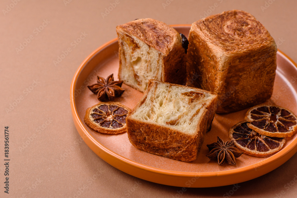 A French cube croissant with chocolate filling, a sweet breakfast pastry. Cube croissant