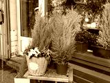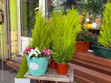 Plants in front of shop entrance. Urban greenery, outdoor market style, seasonal purchase and decorative foliage assortment