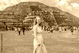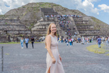Female tourist standing in front of Teotihuacan pyramids in Mexico, enjoying sightseeing, adventure, and cultural heritage. Travel, tourism, and exploration concept