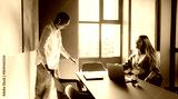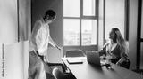 Two young professionals discuss ideas in a brightly lit modern office setting