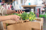 Seller holding kraft shopping bag and wireless POS terminal in store, illustrating modern retail checkout and contactless payment interaction