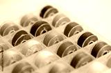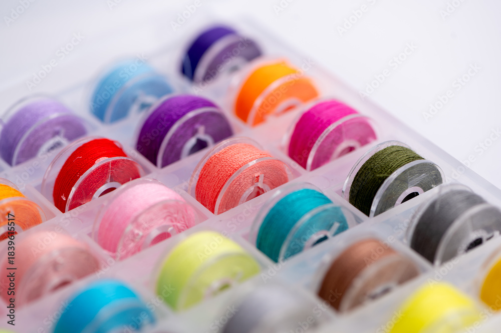 Colorful spools of thread organized in a clear container