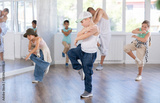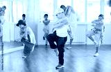 Dance group of children in casual clothes are training together to dance hip-hop and breakdancing in a dance center