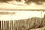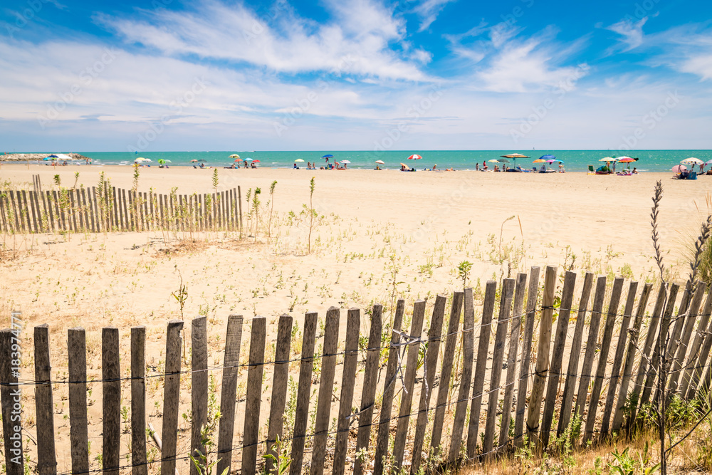Beach with colorful umbrellas, wooden fences and wildlife.