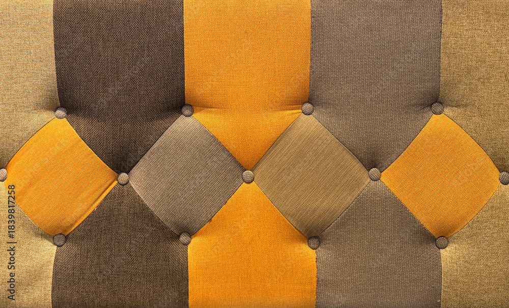 Close up of colorful upholstered panel or sofa cushion in black, grey, and yellow color with beads and button. Suitable for upholstery sofa. Seamless background texture.