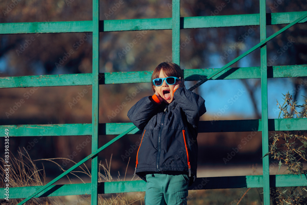 Funny Little Girl Wearing Sunglasses Screaming Outdoors. Energetic kid covering her ears and misbehaving