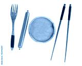 flat lay of chopsticks and fork spoon with sausage isolated on a white background