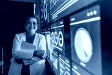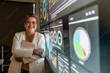 An Asian businesswoman stands confidently in a modern office, holding a tablet beside large digital dashboards with graphs and analytics, reflecting leadership, data-driven decision-making, planning.