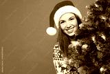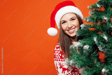 Merry smiling cheerful fun young woman she wear red warm knitted sweater Santa hat posing stand behind Christmas tree isolated on plain orange background. Happy New Year celebration holiday concept.
