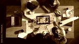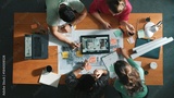 Top down view of civil engineers using tablet to design house structure while sitting at table with project plan placed. Aerial view of team planning and sharing idea about construction. Symposium.