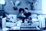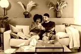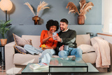 Happy couple enjoying a playful moment together as they share laughter while using their smartphone on a cozy couch, making memories and connecting through their favorite mobile applications.