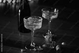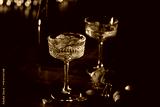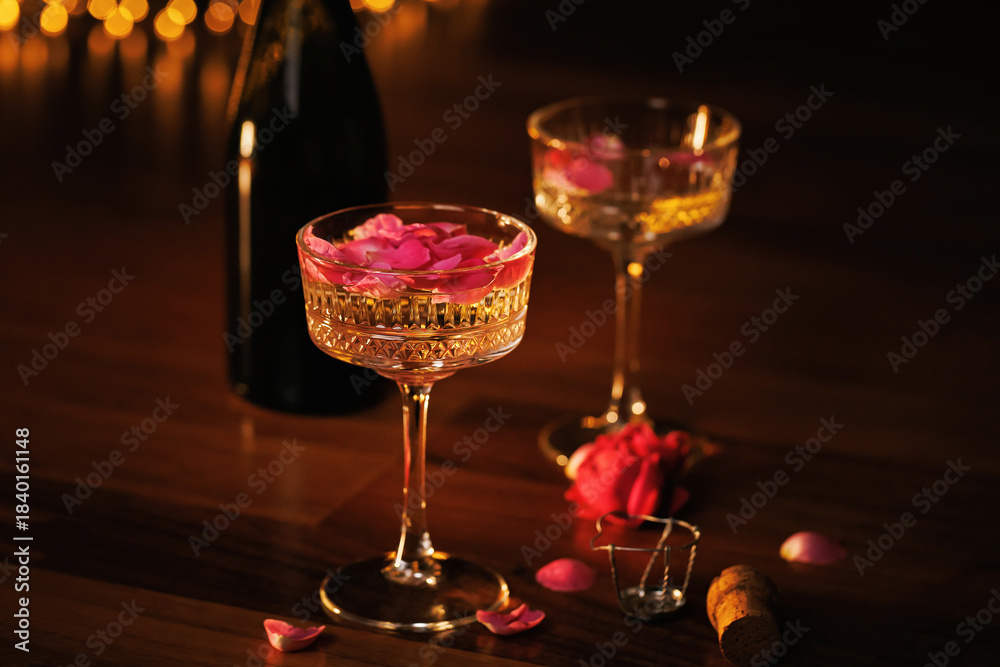 A beautifully detailed crystal glass filled with golden champagne and pink rose petals, bathed in soft, golden candlelight for an intimate and luxurious evening