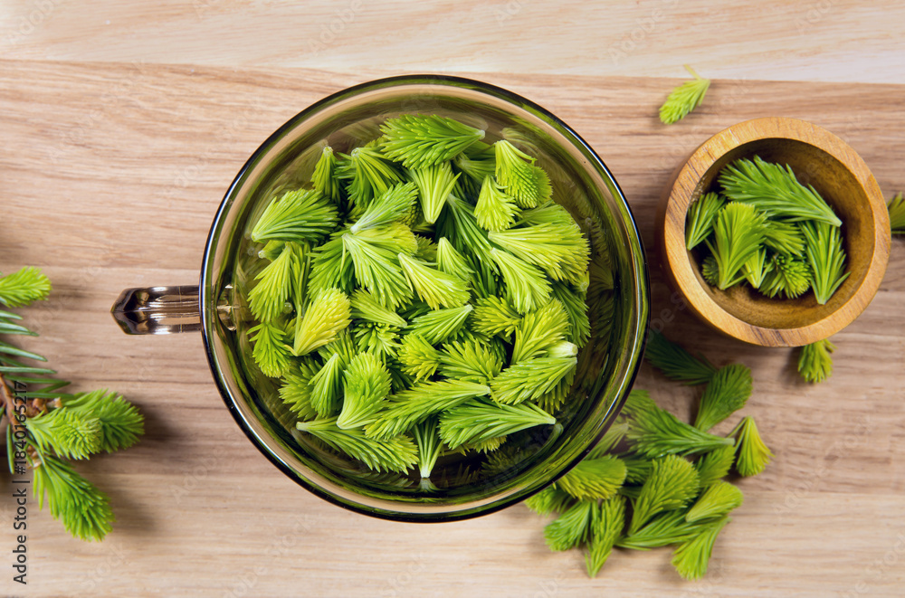 Picked spruce tree Picea fresh tips in spring inside a bowl in home kitchen. Food and herbal medicine ingredients concept.