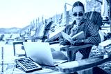 Digital nomad woman working on beach notebook and portable solar panel; wooden lounge chairs, sunny seaside and mountains; sustainable workation, Gen Z remote work lifestyle, travel productivity