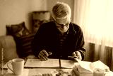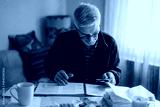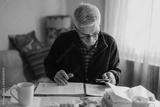 An elderly man sits at a dining table in a cozy home, focused on a spiral notebook and his smartphone. Surrounded by papers, a coffee mug, and light from a window, he concentrates on his work.