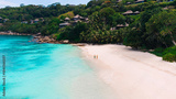 couple relax on beach resort in tropics. Luxury traveling together. Seychelles.