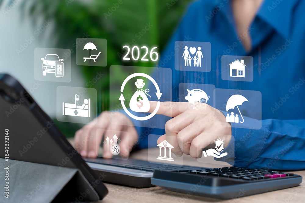 Financial Planning 2026 Concept, Businesswoman Managing Budget Expenses, Housing, Car Payment, Saving Strategy, Retirement Plan, Insurance, Healthcare Cost Management, Sustainable Financial Stability