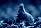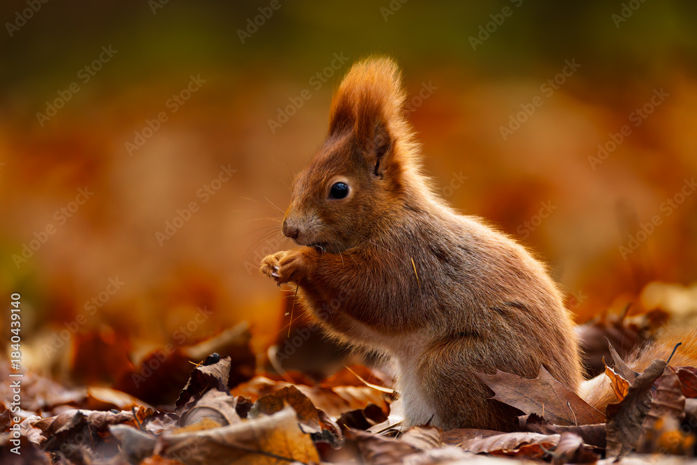 Red squirrel (Sciurus vulgaris) eating a nut among warm autumn leaves, captured in soft morning light with vivid seasonal colors and shallow depth of field. Perfect for nature and wildlife themes